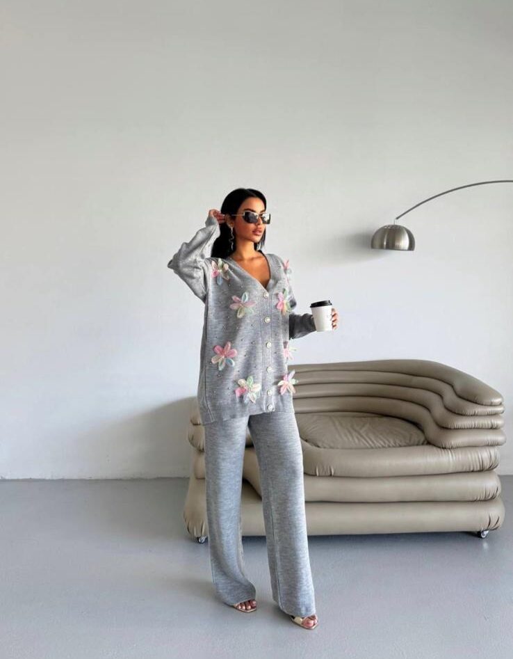 The outfit features a soft light grey knit two-piece set, combining comfort with feminine charm. The top is a relaxed, long-sleeve button-down sweater adorned with pastel 3D floral appliqués in pink and mint, adding a playful, textured touch. It has a deep V-neckline for a flattering, casual look. Paired with matching wide-leg knit pants, the silhouette flows effortlessly and gives a laid-back elegance.