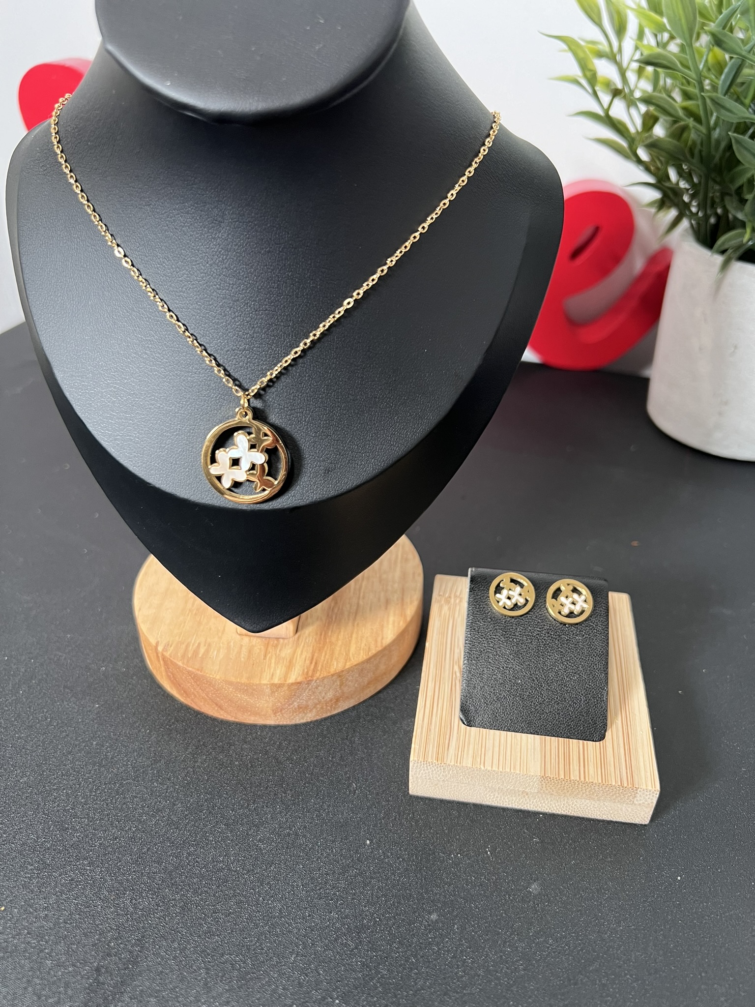 Add a touch of timeless luxury to your everyday look with this stunning round emblem necklace and earring set. Expertly crafted from high-quality stainless steel, this design features a gold-finished circular frame with a glossy white center accent that creates a classy and refined aesthetic.