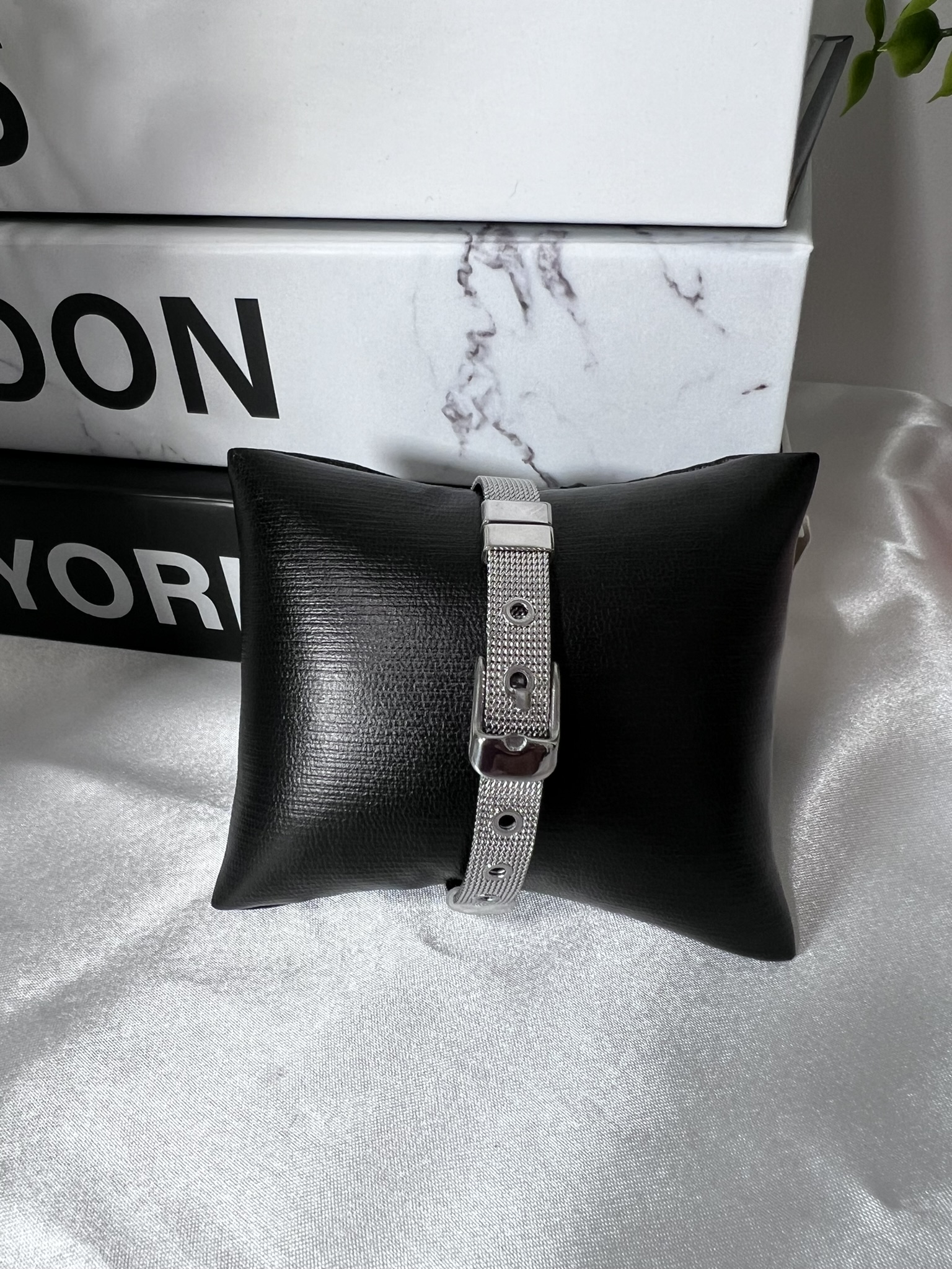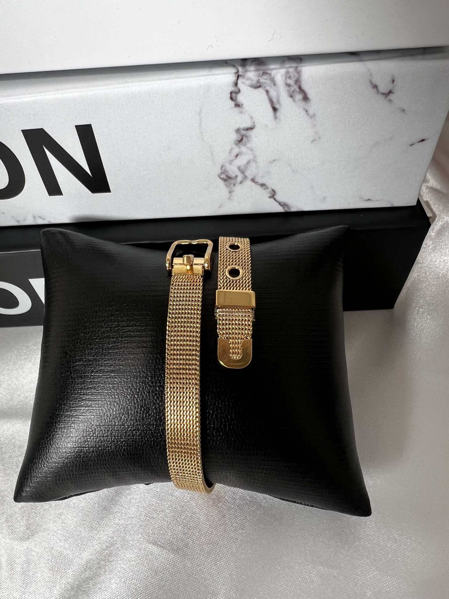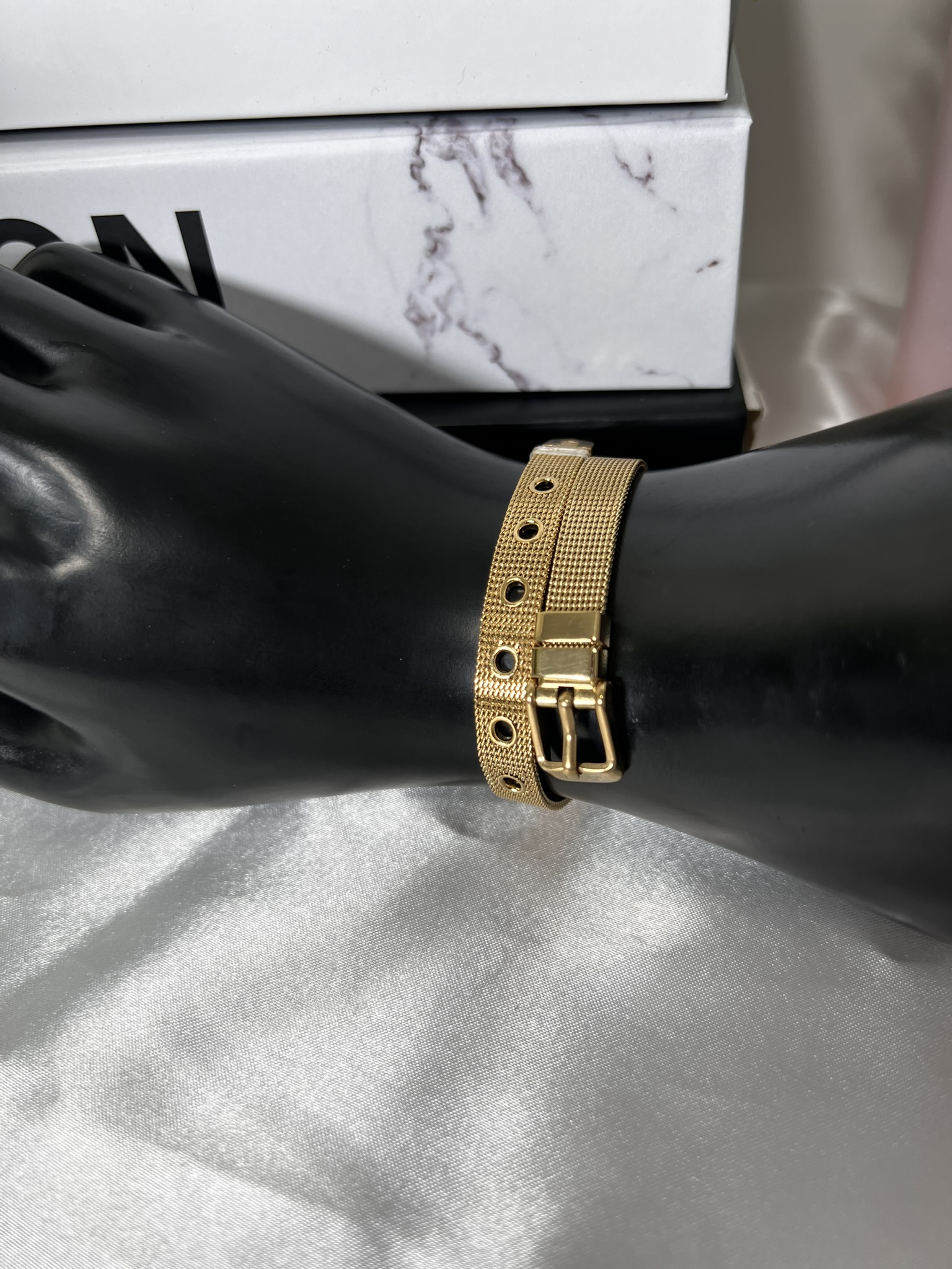 This gold-tone stainless steel mesh bracelet combines modern elegance with everyday versatility. Featuring a sleek belt-style clasp and textured mesh band accented by subtle black circular details, it brings a stylish, contemporary edge to any outfit.