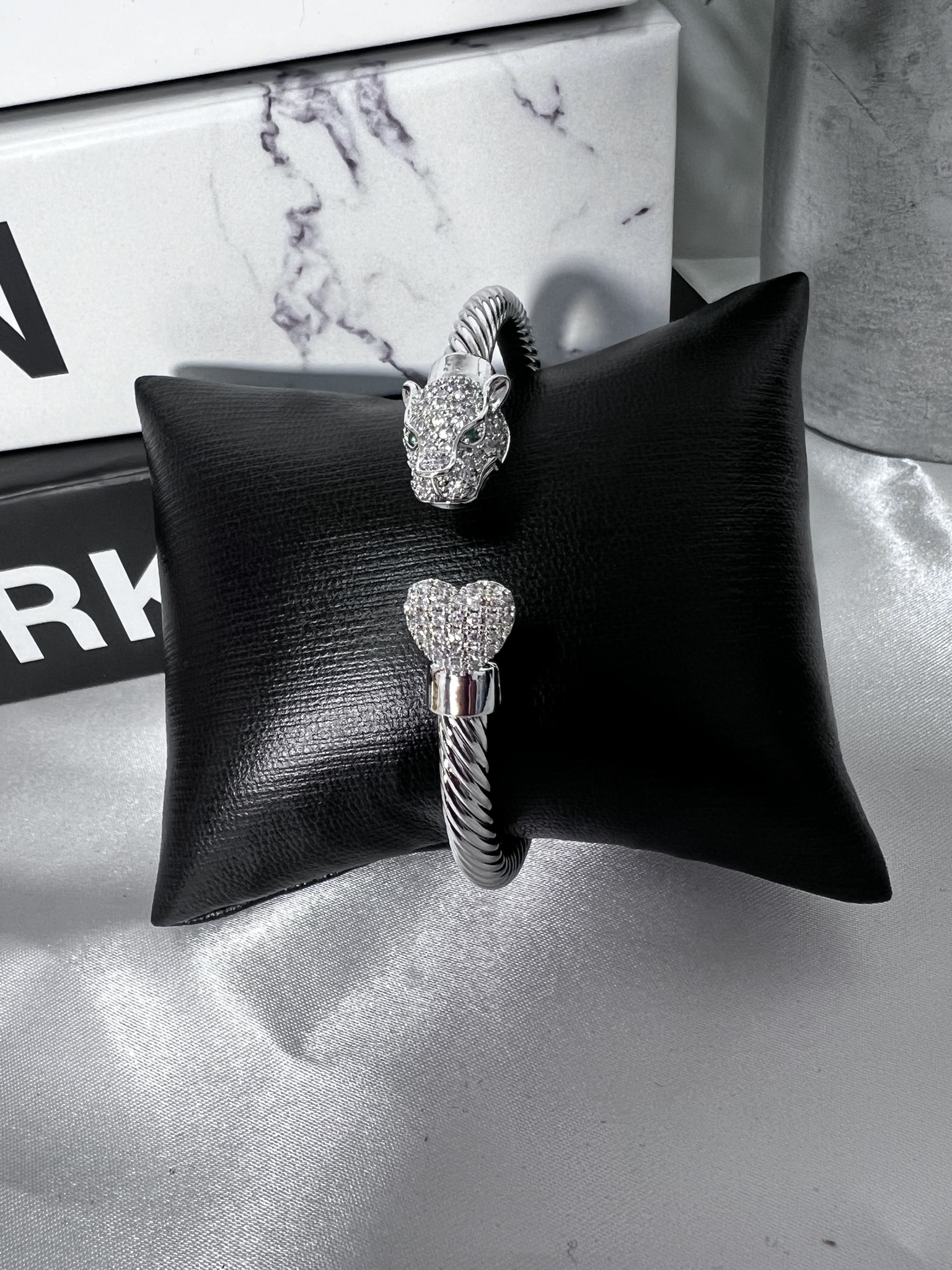 Design: Panther head with crystal detailing and green eyes; heart-shaped crystal end