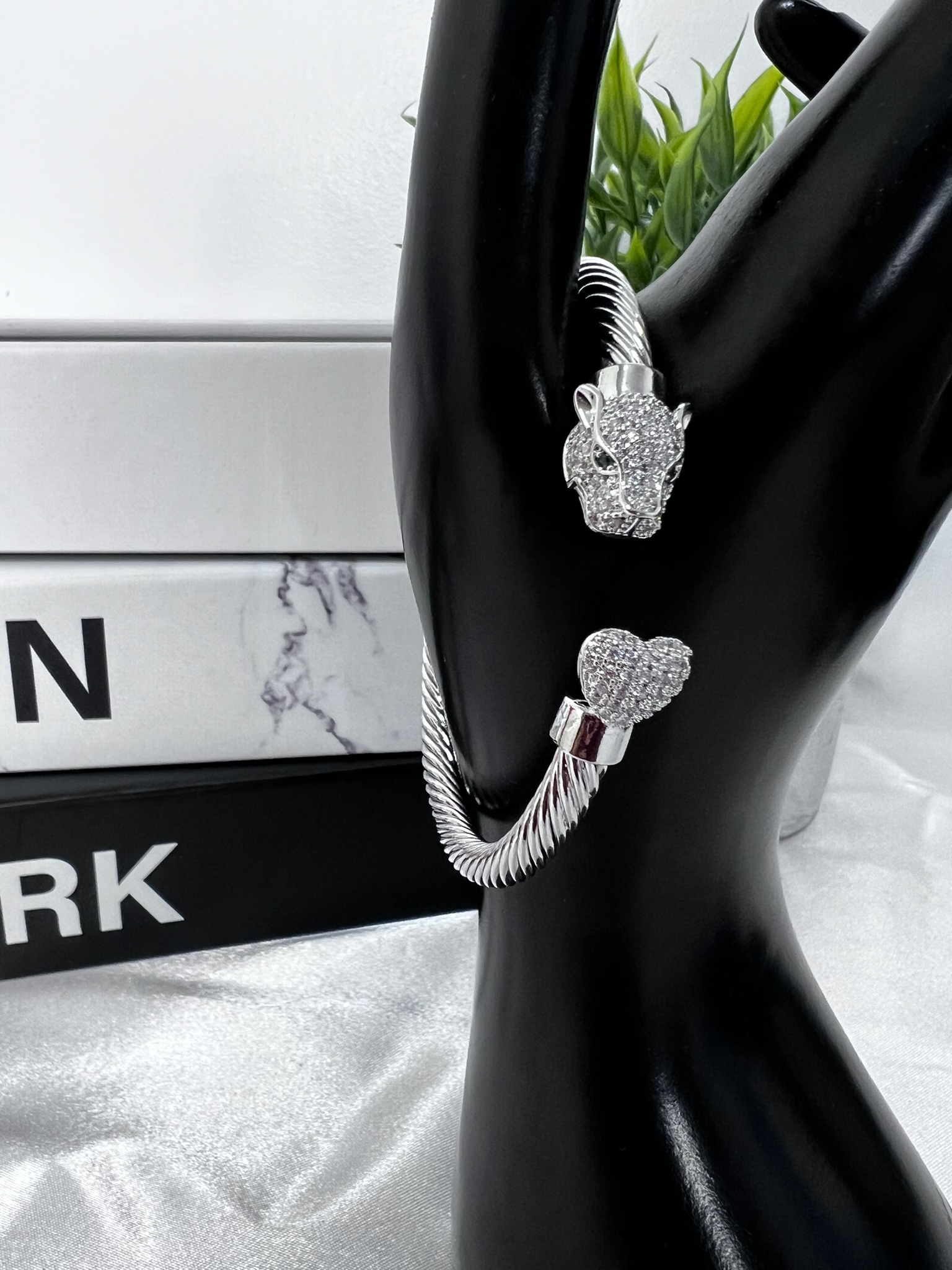 Command attention with this luxurious stainless steel non-tarnish cuff bracelet, featuring a stunning panther head design embellished with sparkling crystals and vivid green eyes. The opposite end showcases a heart-shaped crystal accent, blending strength and elegance in one captivating piece.