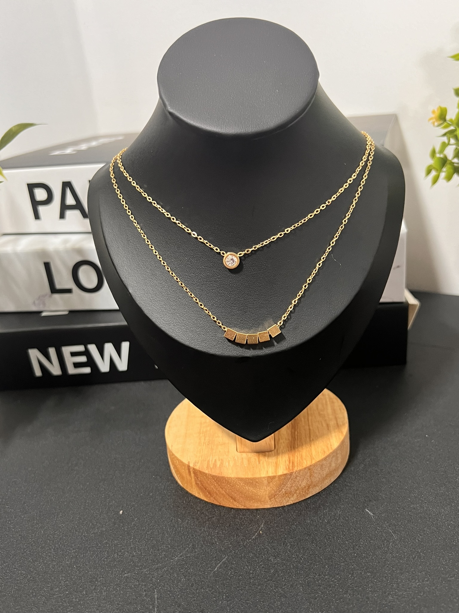 Design: Dual-layer necklace with crystal and geometric bar accents