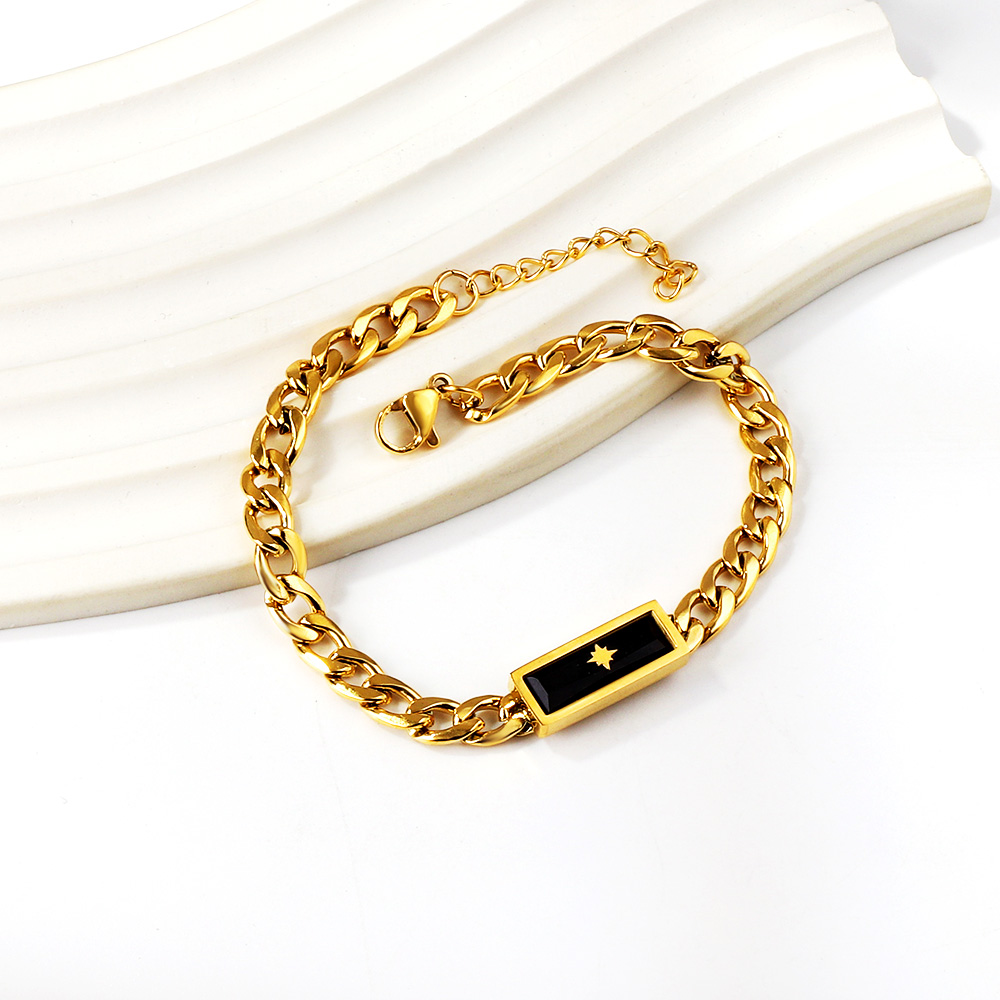 Make a bold yet refined statement with this stainless steel non-tarnish bracelet, featuring a luxurious gold-tone Cuban chain and a sleek black rectangular centerpiece adorned with a subtle gold star accent. The perfect fusion of modern elegance and timeless sophistication.