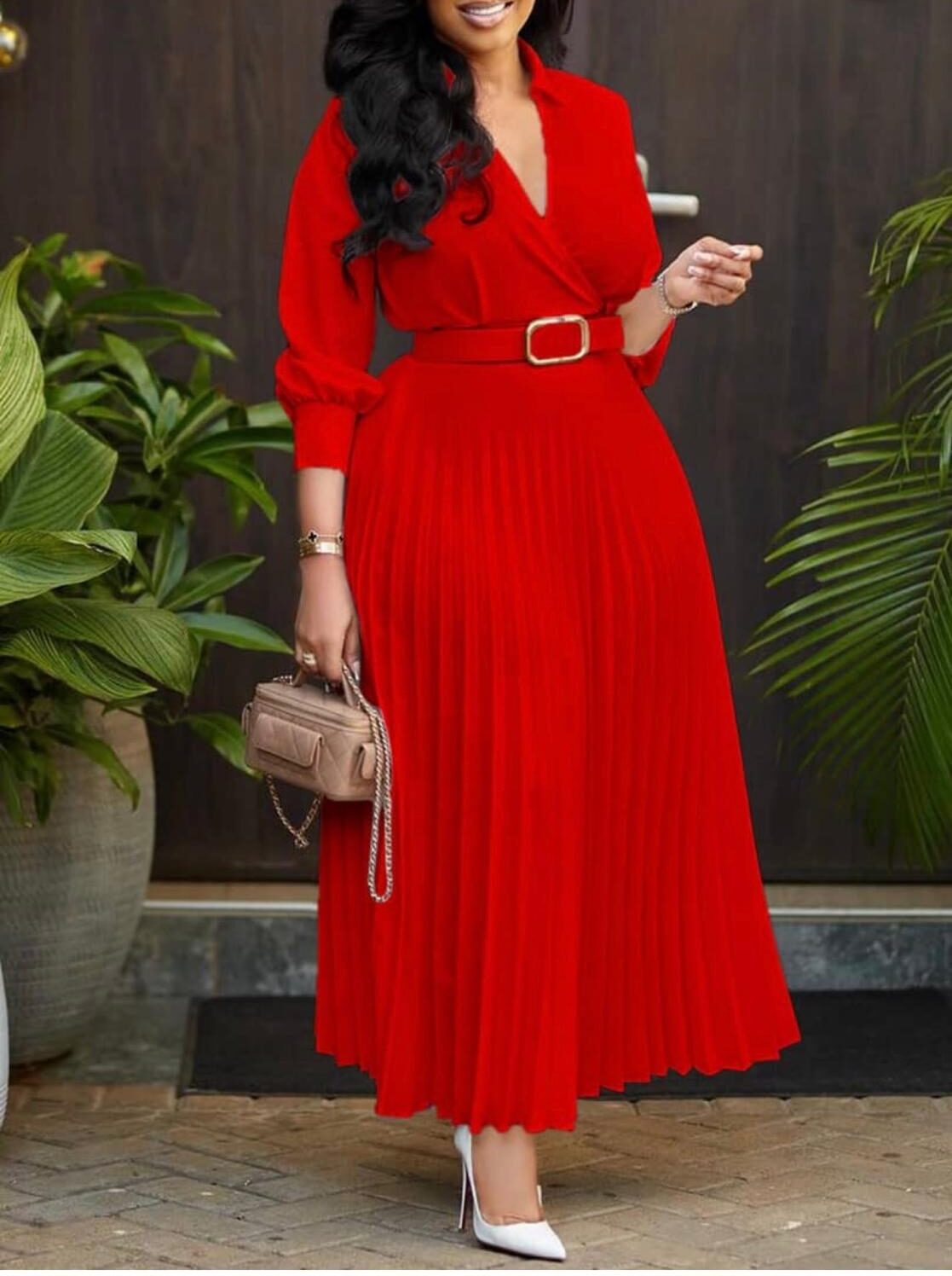 The waistline is accentuated by a matching belt with a gold buckle, highlighting your figure beautifully while adding a chic detail. The long pleated skirt flows gracefully, creating a sense of movement and refinement with every step.